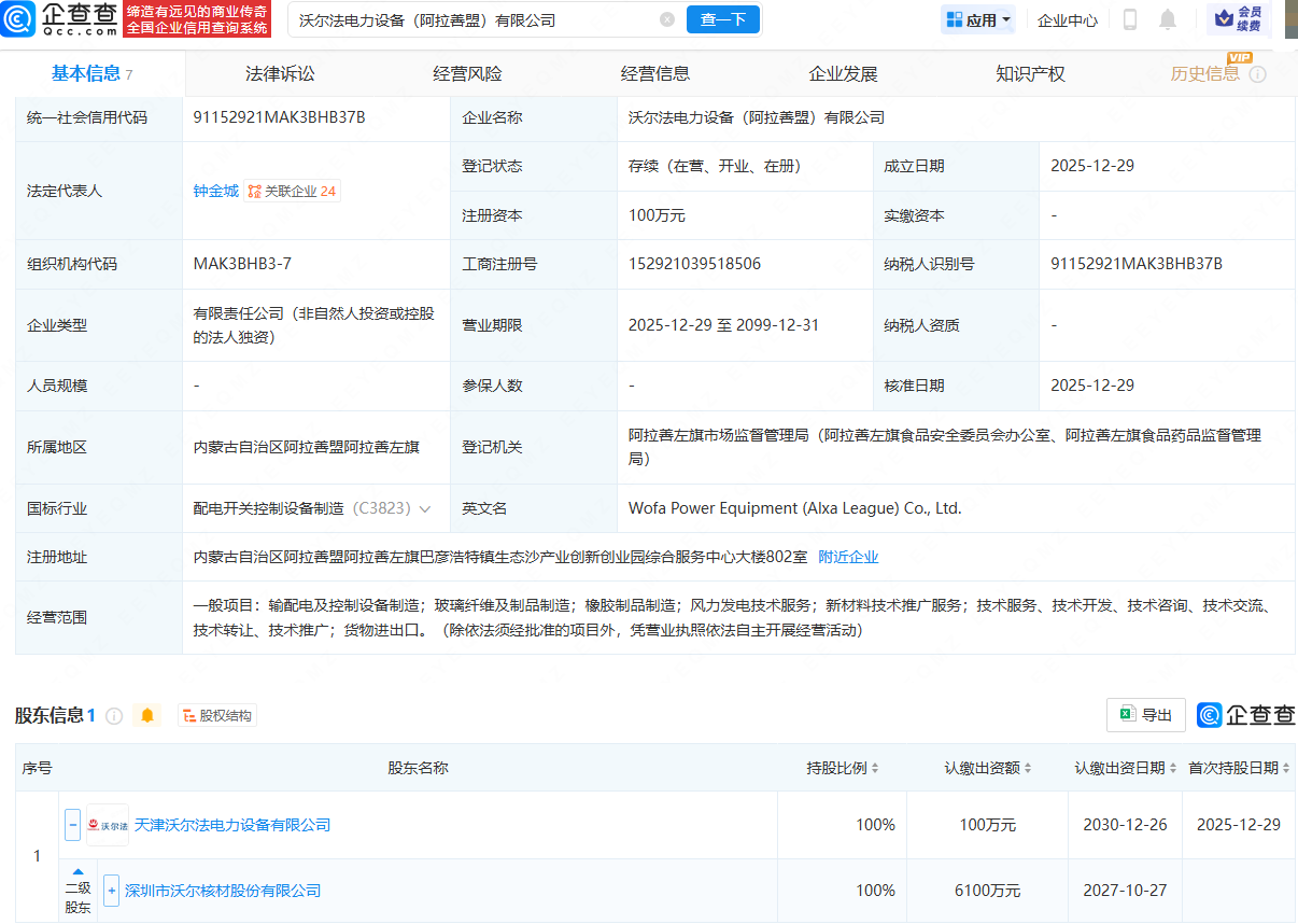 近日,沃尔法电力设备(阿拉善盟)有限公司成立,法定代表人为钟金城,经营范围包含:输配电及控制设备制造;玻璃纤维及制品制造;橡胶制品制造;风力发电技术服务;新材料技术推广服务等。企查查股权穿透显示,该公司由沃尔核材(002130)间接全资持股。