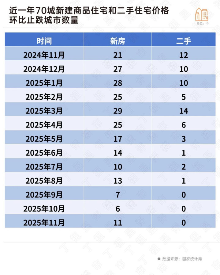 一个积极的信号是,11月房价止跌的城市较上月增加了5个,共有11个城市房价止跌,其中8个城市环比上涨。